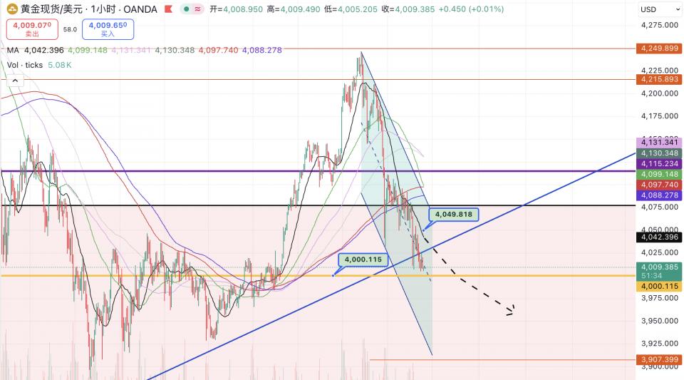 第一个机遇正在4000-3990美元区间,由于一旦金价跌破4000美元,跌势大要率会延续,下方方针看至3980附近。