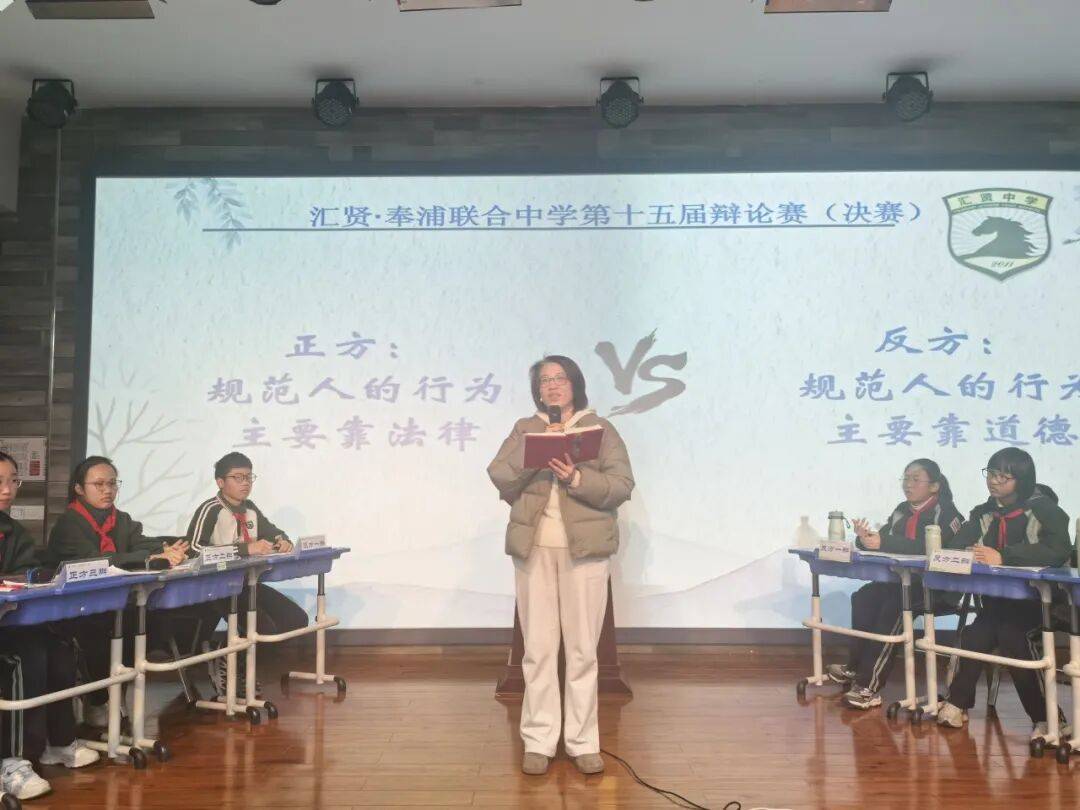 决赛邀请校长杨霞教员、工会芬教员、总务从任徐俊教员、政任韩燕丽教员、副从任朱迪教员担任评委。辩手们环绕“规范人的行为次要靠法令/次要靠”这一深刻议题,展开了一场取价值的碰撞。